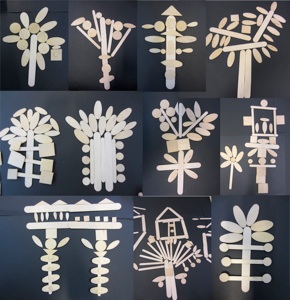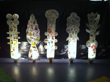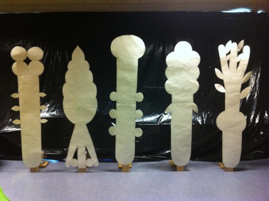 Kleuters hebben met houten vormen bomen gemaakt. Ik heb daar vijf van uitgewerkt op bamboepapier en de naaimachine. Kleuters hebben vervolgens vogels getekend die op de achterkant geplakt werden. Er ontstond er een mooie expositie.