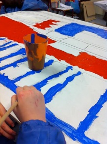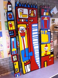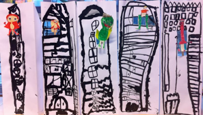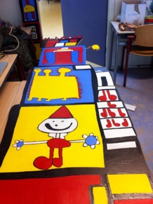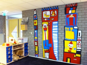 Drie maanden lang heb ik op OBS De Klim in Utrecht een lokaal gekregen wat ik mocht inrichten als mijn atelier. De leerlingen werkte samen met mij voor een afgesproken periode aan een kunstproject. De school had behoefte aan aankleding van de muur bij de bouwhoek. Binnen het thema ‘Sprookjes’ heb ik een lessenserie bedacht waarbij de kinderen torens en sprookjesfiguren tekenden. Ik heb vervolgens de tekeningen samengevoegd in drie panelen die de kinderen hebben ingeschilderd.